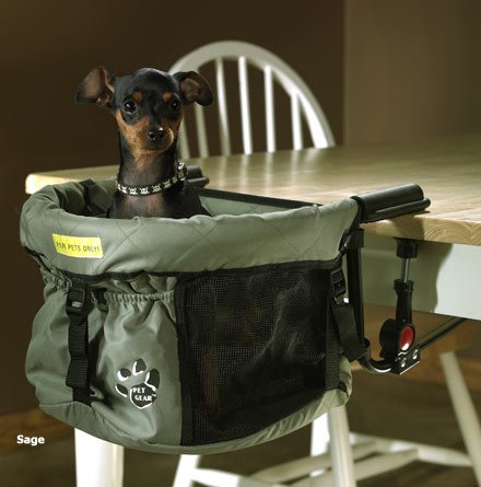 Clip-on high chair for pets is a great alternative to holding your small dog in your lap Lets your pet join you when working at your desk, playing cards or games, or dining Ideal for boosting your pet up to your eye level so he doesn't have to be left out The Clip-On High Chair is a great alternative to keeping your small pet in your lap, while still offering that eye-level boost that keeps him from being left out. Secure chair boosts up your small dog so he can join you when working at your desk, playing cards or family games, and even when dining at your table. Safely clips on to tables up to 2" thick using the same rubber-grip technology used in child clip-on booster chairs. Easy-slide straps let you adjust the height of the chair without tools. Two inner tether straps connect to your pet's leash to keep him safely inside the chair. Made of easy-clean 600 denier nylon with an inner, removable cushion for pet comfort. Machine washable. For pets up to 10 lbs. Measures 12" wide x 9.5" long x 10" high. Please choose color of Sage or Sahara. Features Rubber grips lock on table securely Folds easy for travel use Height adjustable seat Durable 600 denier nylon construction Machine washable No tools required Adjustable tethers for your pet's safety Downloadable Clip-On High Chair Instruction Manual PDF . (Requires Adobe Acrobat Reader 4.0 or later - get it here for free ) Please click on "More Information" for use and care tips.