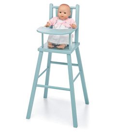 This beautiful wooden heirloom in robin's egg blue features simple designs reminiscent of classic toys. At home a girl can include her favorite friend in afternoon teas, parties or daily meals in this highchair. Give your daughter a toy that reminds you of your own childhood. Measures 29" x 13" x 13". Imported. (Sorry, express shipping and gift wrapping not available.)